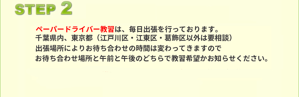 出張での教習行います。ご自宅付近、会社付近などご希望の場所をお知らせください。